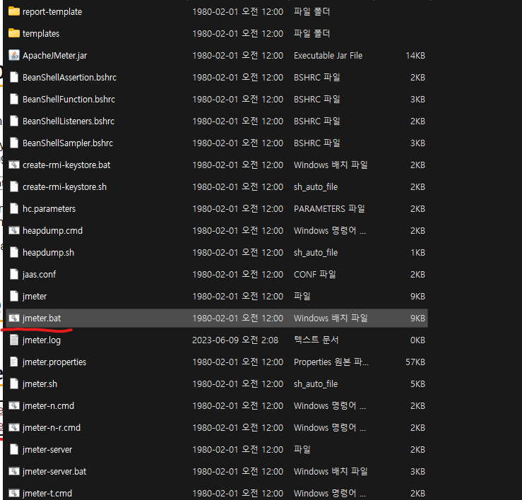 1. 압푹춘 폴더의 bin폴더 안 jmeter.bat 파일 실