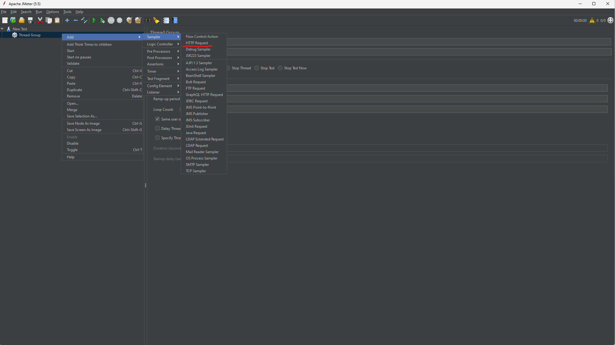 Thread Group 우클릭 -> Add -> Sampler -> HTTP Request 클릭