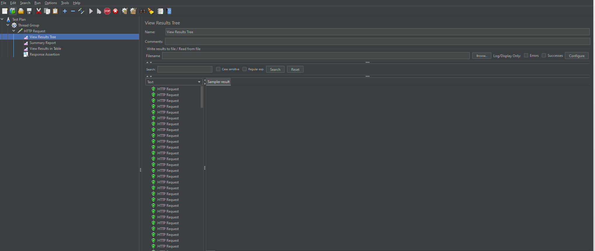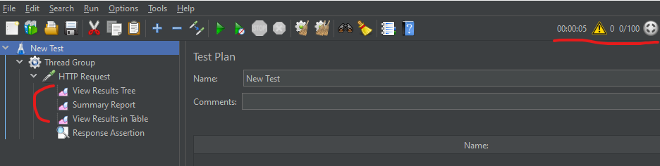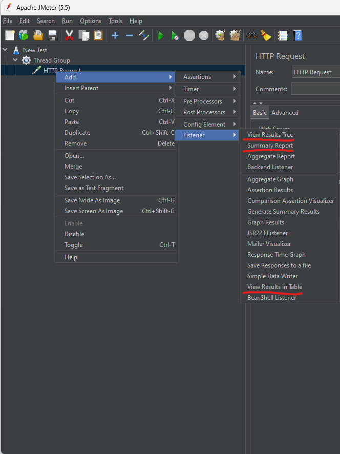 위에서 만든 HTTP Request에 오른쪽 클릭 -> Add -> Listener -> View Results Tree,Summary Report, View Results in Table 생성