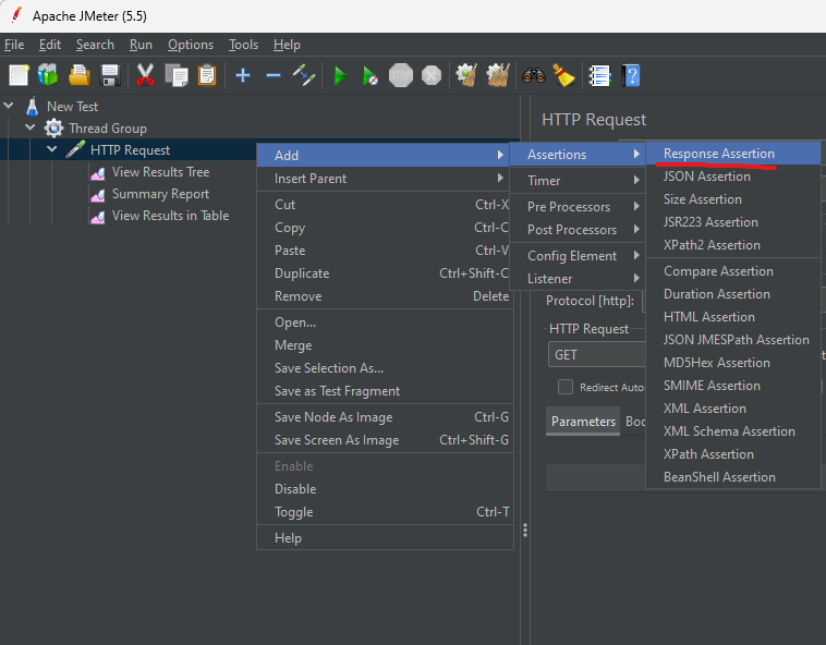 위에서 만들었던 HTTP Request 우클릭 -> Add -> Assertions -> Response Assertion 클릭