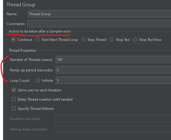 - Loop Count : infinite | n 으로 값을 설정할 수 있으며 설정된 값에 따라 Number of Threads X Ramp-up period 만큼 요청을 다시 보낸다.
